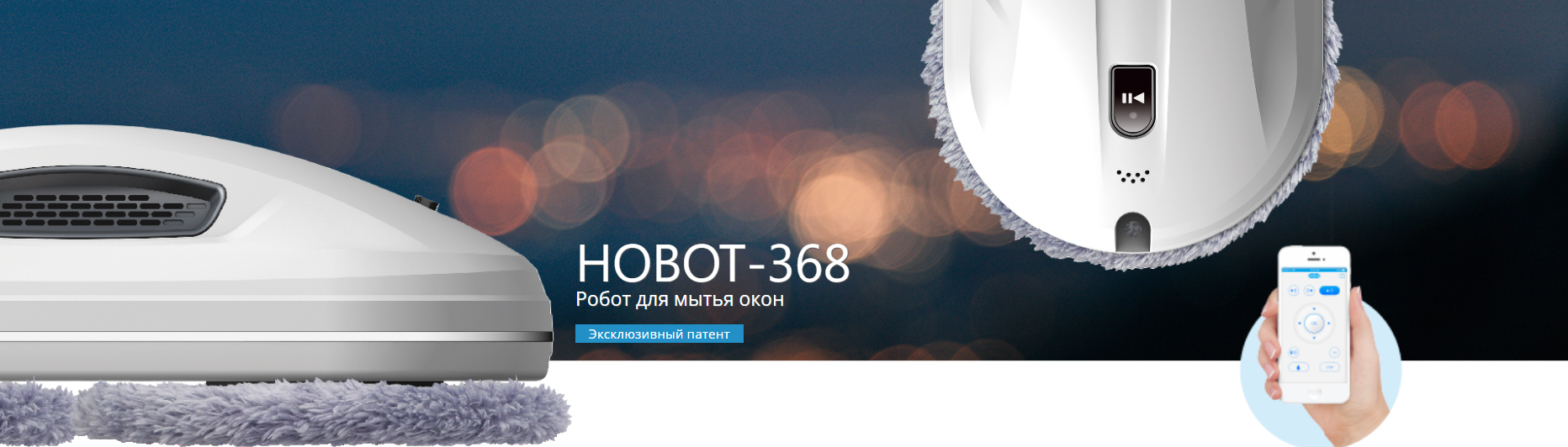 HOBOT-368 выполнен в компактном корпусе белого цвета с черными элементами. Устройство выглядит современно и аккуратно, а небольшие габариты и вес всего 0.94 кг делают его удобным для работы с окнами, зеркалами и другими стеклянными поверхностями.